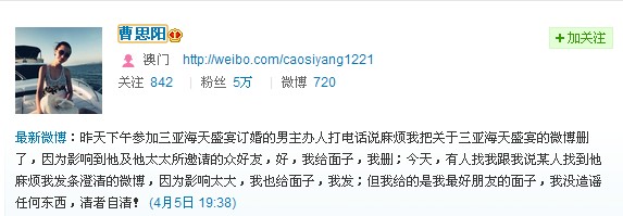 在微博上爆料“三亚海天盛筵涉淫”的网友“曹思阳”,于4月5日16:15发声明并致歉,她表示之前发的三亚海天盛宴的微博图片源自其朋友4月3日10:54发布在朋友圈的内容,自己近阶段一直在苏梅岛度假,并不知道三亚发生的事情,纯粹是转发。    [--...