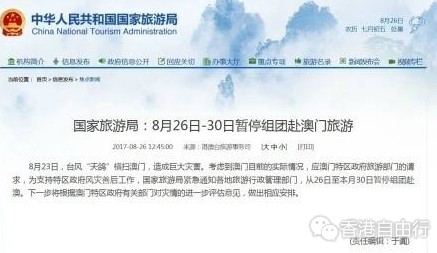 8月23日,台风 " 天鸽 " 横扫澳门,造成巨大灾害。考虑到澳门目前的实际情况,应澳门特区政府旅游部门的请求,为支持特区政府风灾善后工作,国家旅游局紧急通知各地旅游行政管理部门,从 26 日至本月 30 日暂停组团赴澳。下一步将根据澳门特区政府有...