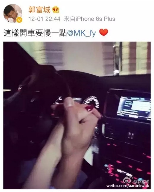 昨天晚上,郭富城在微博晒出一张牵手照并@MK_fy ,高调示爱!微博底下的评论瞬间就炸了!这还不止,这一晚上可忙坏了网友们!这位 MK_fy 小姐也转发了天王的这条微博进行互动!网友们飞快地扒出,原来这位和郭富城秀恩爱的 MK_fy ,名字叫方...