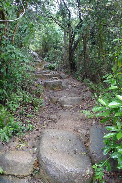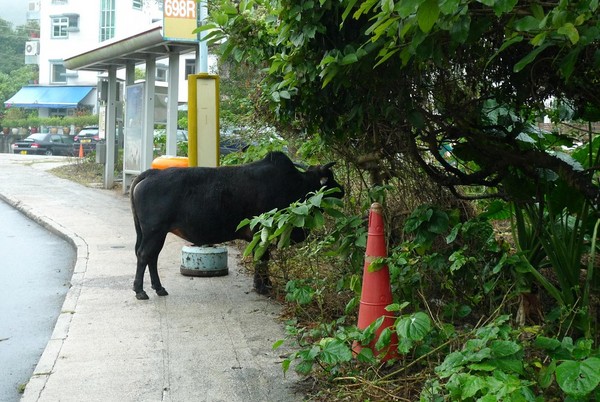 15日,安排的自由活动。于老师和杨同学几乎走遍了香港的DFS。卿卿和亮亮原本要跟我和石头走麦径,但卿卿赖床,就说中午和亮亮去西贡找我们。清晨和石头在楼下吃了顿很香港的早餐,然后地铁到彩虹站,等只有周日才有的96(还是96R的,记不清了)巴士。特别喜欢在陌生的城市坐公交,不知道一路上会有怎样的景色~巴士在山中环绕着,经过了香港监狱,在西贡巴士总站那儿,正在举行马拉松……和石头在一起,总是会有意外的惊喜~计划走麦径第二段,因为第二段起点没有巴士,我们就坐到第二段终点,往回走。行前功课做的太少,从M48走到M46,之后就完全不在道上了……攻略里说麦径上的标示很多,地图牌很多,不会走错路……但我们还是在第一次选择上,就走错了方向,直奔黄石码头而去……因为下雨,一路泥泞,一路磕磕绊绊,好在景色纯天然,围着一个山中湖走啊走,偶遇一个废弃的村子,破败的房屋无人居住,一棵大树上住满了猴子,上蹿下跳的向周围大树扩散。第一次在野外看着猴子,我又兴奋了……兴奋之后就害怕猴子会不会下来抢东西或者从树上往下扔石头。仓惶的逃离了那个村子,继续前行。湖里好多帆船还有皮划艇,大概黄石码头是个训练用码头吧?走了大概两个小时,终于看着地图牌了—离我们最近的有标示的地点,竟然是我们的起点,麦径第二段终点。我们的行程是反着麦径第二段绕了个圈,刚才走过的路,被定义为“未修好的路”,忽然觉得自己当了两个小时的野人……路上给卿卿电话问她在哪儿,她说不知道在哪儿,我说我也不知道我们在哪儿……中午的海鲜大餐就剩下我和石头了……决定不再继续这条小路,就近找了条大路,寻找巴士车站。一边走,一边感叹之前有警示说要爱护野生动物,原来真的有野生猴子啊!正说着,从马路对面走过来一头大黑牛……逍遥悠然的横穿着马路,来到我要看的站牌前……石头执意不让我看这个站牌,要到对面去看,我看这牛吃着树叶,好不自在的样子实在可爱,但为了安全,还是远离吧……当时我的八达通只有1.7,已经不能用。好在车站有个女士也在等车,石头问了下站牌上标的票价在上车的时候怎么投币,又从女士那儿换了一兜儿硬币,整个过程全英语,我又当了回不明真相的围观群众……好吧,女士的最后一句话我听懂了—你的英语很好!
