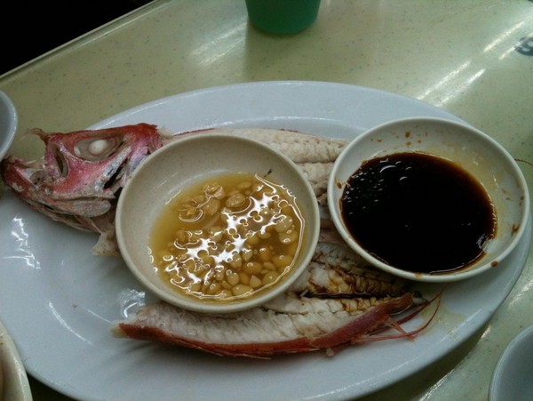 (在酒店楼下吃的,几乎每桌都有一条这个鱼,鱼皮很硬,直接吃上面的大白肉~)