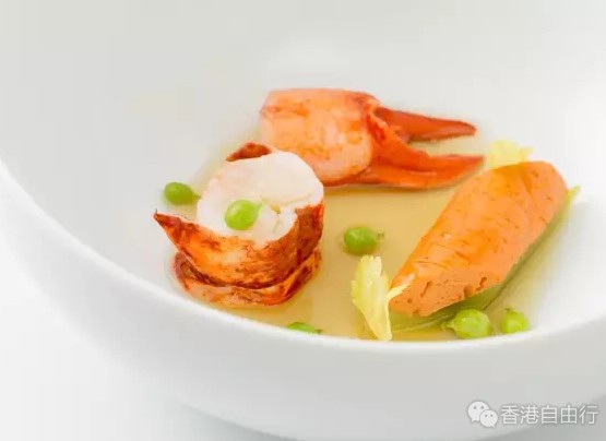 先把蓝龙虾放入由龙虾壳和绒蟹淆成的清汤中煮四分钟至三成熟,再配上清新青豆、爽口芹菜和龙虾膏慕丝,为这轻盈菜式增添新鲜感。