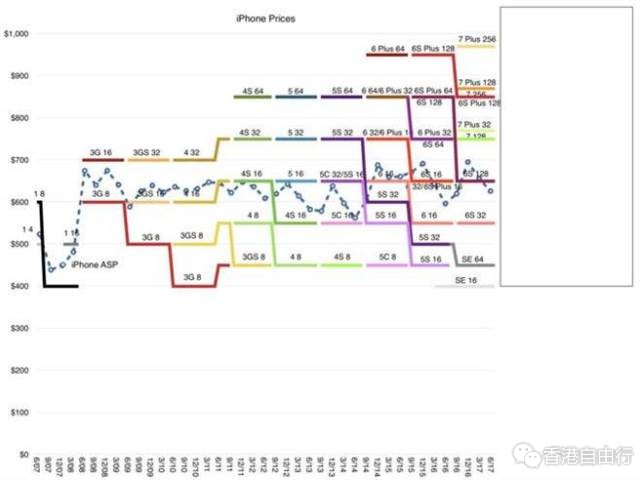 研究机构 Asymco 分析师 Horace Dedi提出的iPhone价格楼梯式模型。(图/摄Apple Insider)
