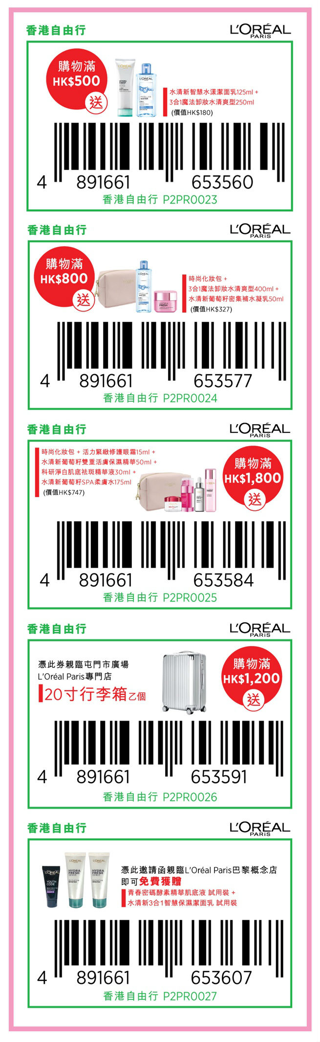 凭本微信优惠劵亲临巴黎欧莱雅香港屯门市广场全新巴黎概念店消费即可享受以下独家超值优惠!