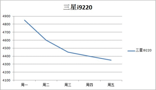三星GALAXY Note i9220隶属三星银河系列,而且也是这个系列中出众的一款机型,拥有5.0英寸的超大屏幕赢得了众多朋友的喜爱,本周这部银河旗舰机一直走下坡路,虽然一直没有跌出4000之外,但是面对这样一个价格趋势,走出4000恐怕只是时间问题,下周中这部手机应该还会有300元左右的降价,毕竟三星i929的上市一定程度上给这部手机造成了压力,所以想要入手的朋友不妨趁早入手。