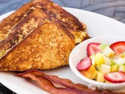 儿童份量的法式多士(French Toast)或白脱奶班戟(Buttermilk Pancakes),配烟肉及鲜果。
