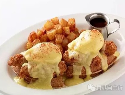 华夫饼上有脆炸鸡柳及水煮蛋,微辣的炸鸡沾上荷兰酱及牛油枫糖浆后食用,令你的星期日滋味无穷!