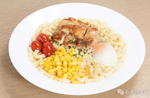 鸡扒、温泉蛋、粟米、小番茄、通心粉