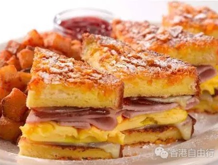 酥脆的法式多士内夹着烟肉、烤火腿、炒蛋及热熔瑞士和芳缇娜芝士,另配草苺酱,多重美味,口感丰富。