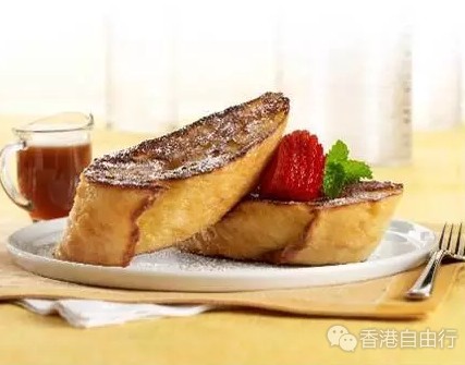 特选法式乡村面包,切成特厚片,放在自家调制的奶油蛋浆中浸泡一整日,令蛋浆完全渗入面包之中,焗暖后再煎至金黄色,外脆内软,撒上糖霜及牛油枫糖浆,香甜可口。