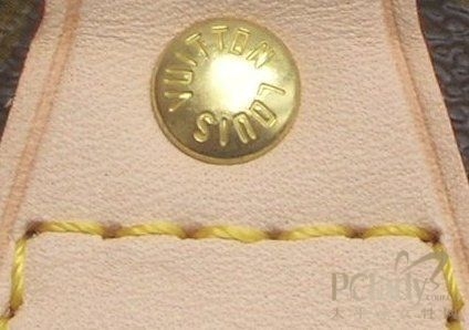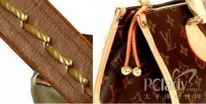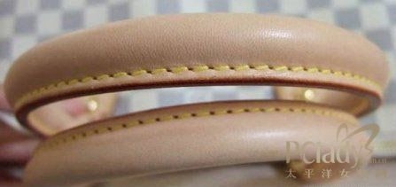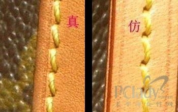5.从配皮针脚及封漆等细节看。LV的车缝线不但工整对称,且是上过油蜡的麻棉线,可作为辨识的细节。凡是LV产品,粗而韧的缝线会在相等间隔的缝口,据说每英寸严格规定多少个针脚。且内格手工车线也一样一丝不苟,翻开LV手挽袋内层手挽扣处,固定位的贴皮位置亦端正。现在的仿货即使外表可以做到,但内里的线位很难做得这么一丝不苟。以前说从针角可以分辩,假包通常一条线下来是笔直的,真包上的是每个针角有个角度,象连着的柳叶状,有个角度。但现在做得超A以上仿的也可以做到这点了。所以这点不足以为凭了,只能作为检验真包仿制精细度的标准了。下面两个用旧的真假包配皮对比来看。从照片其实已经看不太出了。但摸上手感就稍有不同,仿的皮质就比较硬且亮,真的稍软些。此外观察真假新包所用的车线,也有不同,不过这个只限于新品的区别,只作为参考。真品是黄色(可以参考上一楼的图)。而仿的不知为什么总是用的颜色不对,用很怯的鹅黄色,或很艳的正黄。但通常只在新的时候较明显,假的用旧了,从线的颜色就会分辩不太出来了。