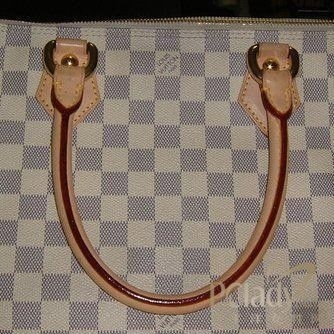 4.从配皮上,有人说看防伪线和滴水变深测试。这点实际上超A以上级都做到了。所以还是要从细节来看。先说包包周围衔接老花的白色原皮细滚边,真品LV通常很细,笔直,圆且立体,一整条下来非常均匀工整没有断开看不到接缝,没有扭曲变形或稍微扭劲儿等问题,有的即使好的仿品细看会稍粗。