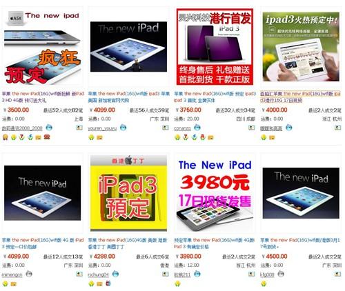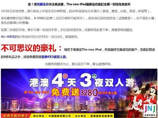 除了实体商家外,新iPad的销售在淘宝等一些网上商城上也是相当热闹,只要搜索“新iPad”或者“The New iPad”就会出现多条出售信息。笔者也了解了一下,多数商家都表示能够在第一时间拿到新iPad,近两天内就会开始发货,乞丐版的最终价格大多都在4000元人民币左右。甚至还是有商家打出了“买新iPad,送港澳4天3夜游”的的广告。