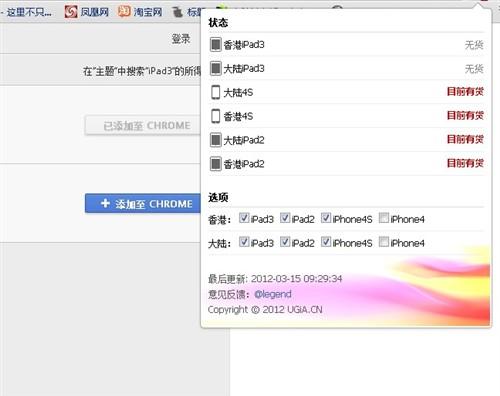 在新iPad发布后的短短时间内,美国官网就出现了缺货的现象,而香港方便更是半小时之内就已经无法再接受预定,只能选择用抽签的方式发售,除了消费者的热情高涨外,还有一个重要的原因就是可恶的黄牛在中间作梗。下面笔者就为大家推荐一个实用的小插件,功能比黄牛们的专业软件一点也不差,让你可以随时了解官网货源信息。