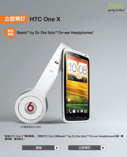 此次在香港开始预售的HTC One X则被冠以了“尊尚套装”名义,也同样在销售包装中会附送一只顶级Beats耳罩式耳机,其价值约为1800港币(约合人民币1466元左右)。用户只要在3HK、SmarTone、PCCW Mobile、澳门电讯及多间指定的销售商处,填妥网页上的订购表格便可完成登记。