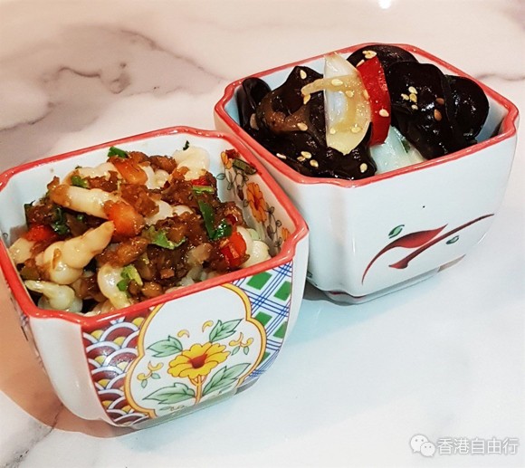 先由这两小碗泡椒宝塔菜、云南凉拌猫耳朵开始。宝塔菜卖相奇特,外形有如一条雪白的小虫,用上泡椒配搭,口感酸辣鲜香,而且绝不嚡口,食落亦无渣,细腻爽脆,好吃。至於云南凉拌猫耳朵,其实是陈醋黑木耳,经过陈醋浸泡的木耳,入口清爽脆嫩,略含胶质,再加上缠绵悱恻的辣意,让人有淋漓的快感,用作前菜就最适合不过。