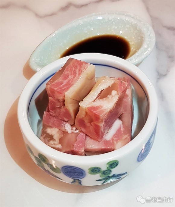 接着品尝的水晶肴肉,是江苏镇江传统名菜,而这里的出品,水准亦做得很不错,肴肉分成两层,上层是猪皮冻,而下层就是半红半白、以猪手丝及猪皮熬煮至起胶制成的肴肉冻。挟起咬下,肉质结实、鲜嫩香口,蘸点香醋吃,不肥不腻,香酥味美。