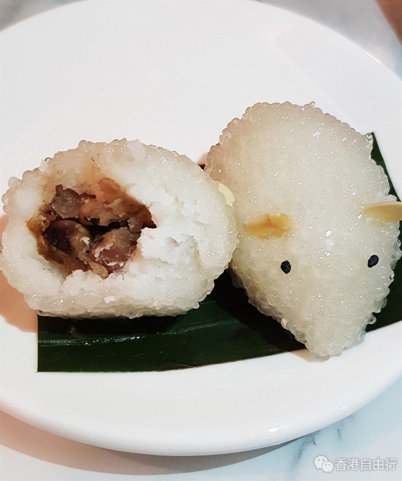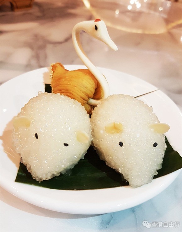 之后是两款卖相 Cute 爆嘅点心,分别是老鼠爱大米、银湖天鹅酥。翻看菜单,原来老鼠爱大米是 Chicken Bun,挟起细看,造型超级可爱,而且晶莹剔透,咁萌边舍得食!忍心一口咬下,入面除咗有鸡肉馅料外,还包入了新鲜眉豆粒,入口又香又软嫩,不肥不腻。