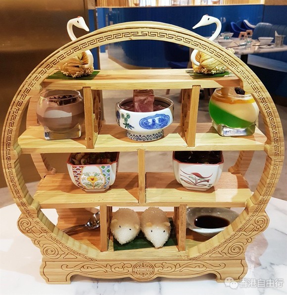 终于轮到吃让人期待的宫廷点心盘 ($188),点心盘卖相果然出位,以下午茶常见的四层木架盛载,非常吸睛,感觉高雅,惹来邻桌不少艶羡目光。成品端上後,逐一细看,原来木架上共有六款凉菜、点心及甜品,包括有泡椒宝塔菜、云南凉拌猫耳朵、镇江水晶肴肉、老鼠爱大米、银湖天鹅酥、杯仔甜品,啱晒贪新鲜,样样都想试吓的朋友仔。