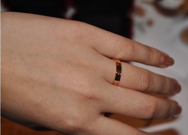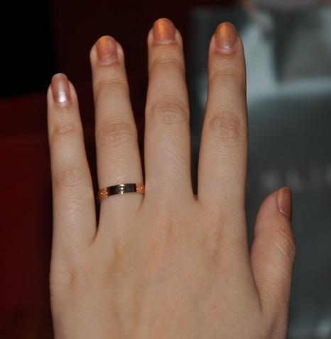 购于海港城对面,因为下雨,人不是很多,小排了一下队。玫瑰金,love系列,老公说他戴素圈,给我弄三颗水钻的,但我当时毫不犹豫的说对戒就要一模一样的才叫对戒,所以俩人必须带一样的。