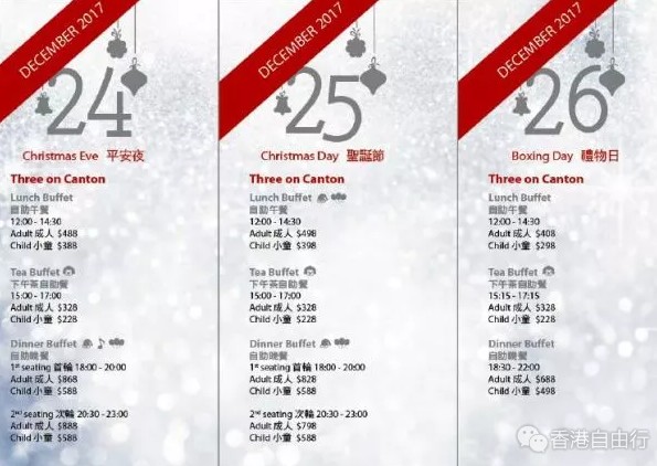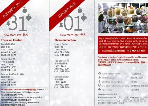 12月24日平安夜,酒店安排了圣诗班在Three on Canton报佳音,以美妙的歌声为宾客送上祝福。圣诞老人更会于平安夜及圣诞夜到访Three on Canton,向小朋友大派礼物,让宾客在欢欣的氛围下与挚爱亲朋共度佳节,品尝精彩的时尚圣诞盛宴。