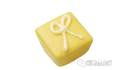 清新软滑柠檬白巧克力酱配搭犹如空气般轻柔顺滑的椰子慕丝,再加上清香椰子碎,藏于夺目的黄色外壳中,面层再缀以白巧克力蝴蝶结。