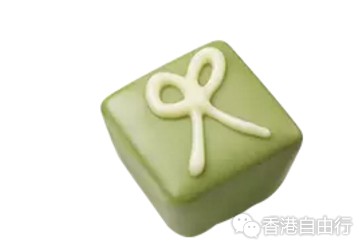 幼滑开心果蓉巧克力酱加上一层香滑焦糖白巧克力慕丝和开心果碎,被充满节日色彩的绿色外壳包裹着,面层再缀以白巧克力蝴蝶结。