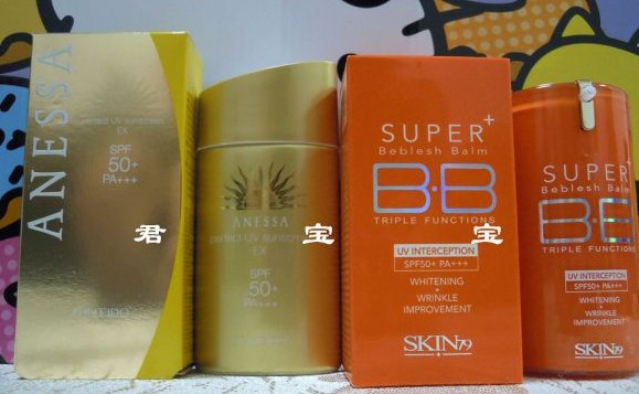 右边这个可是重点推荐啊,之前是在韩国杂志上看到广告,觉得这skin79家真逗,BB霜颜色还真多,这个新款BB霜的颜色也太讨喜了吧,说是韩国刚一上市又卖疯了,彻底抢占了谜尚的风头啊,香港找好久就一家店刚上,买回来第二天就迫不及待试用了一下,滋润度适中、遮瑕度中上,比老款的粉桶和黄金桶真是强百套啊,味道大爱,新款标榜的抗氧化美白功效就慢慢体会吧,这个产品买的很满意 人家可是有个好听的名字呢,叫:顶级365天维他命鲜橙BB霜SPF50PA+++ 君宝买的118米