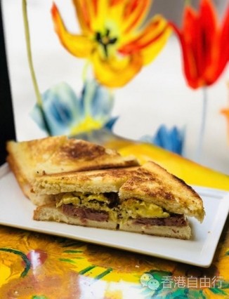 店中还有另一名物 --- 幸福三文治($30),以牛油烘香的面包,夹住滑蛋、厚切午餐和芝士,份量十足,邪恶又好味。