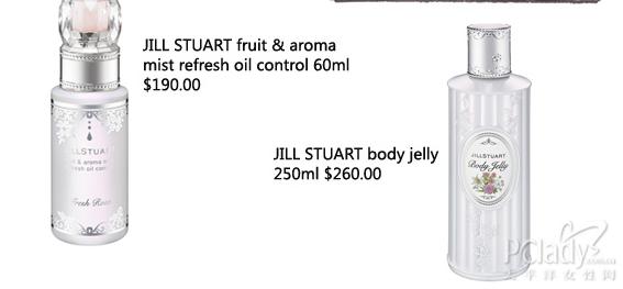 妆品之外,JILL STUART 同时带来两款适合夏天使用的 body jelly 及保湿喷雾。清新白花香味的啫喱状身体美容液具冰凉舒服的触感,花卉及丝绸成分的滋润与薄荷的紧致效果,清爽之余令肌肤持续柔滑。保湿喷雾就用于脸上,能收紧毛孔,即使喷在妆容上也不会脱妆,有效防止油光,缔造清爽光滑皮肤。