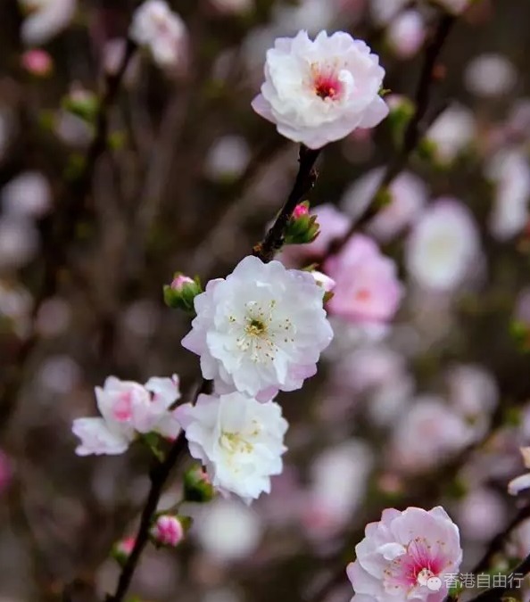 根据渔农署网页,郁李是落叶灌木,花白色或粉红色,春天盛开时枝条满佈花朵。果红色,味酸,现正开花;