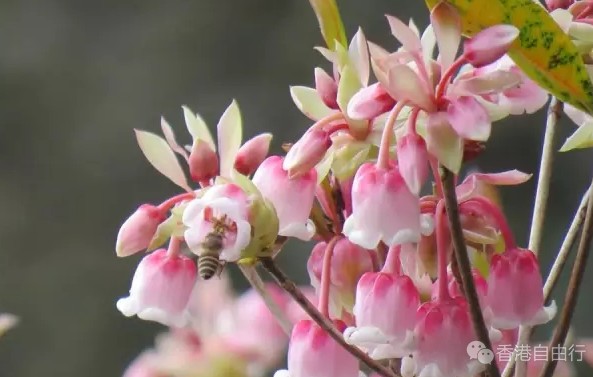 根据渔农署网页,吊钟花是落叶或半落叶灌木或乔木,粉红色或红色呈钟形的花倒悬于纤细的花柄上,常于农曆新年前后开花。