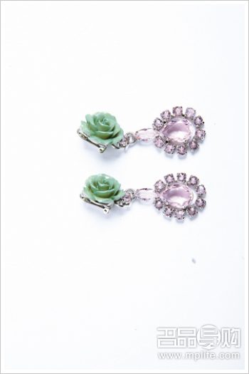 奶绿色玫瑰花缀粉红色宝石饰耳环 $4,750