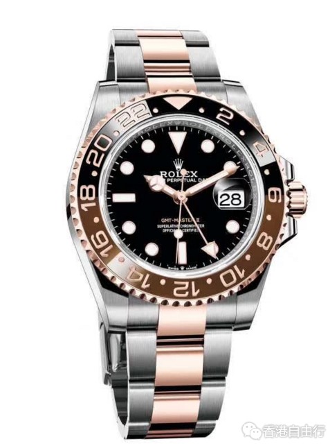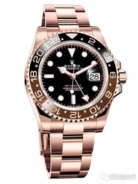 GMT-Master II首次推出了18K永恒玫瑰金钢款,蚝式表壳的外侧及表耳採用了全新的设计,搭配新一代3285 机芯。黑啡双色圈搭以蚝式18K永恒玫瑰金钢,更加典雅。表面上的「GMT-Master II」 字样用了粉玫瑰红色配衬,加上劳力士最新研发的棕黑双色 Cerachrom陶质字圈,为黑色表面注入细节。