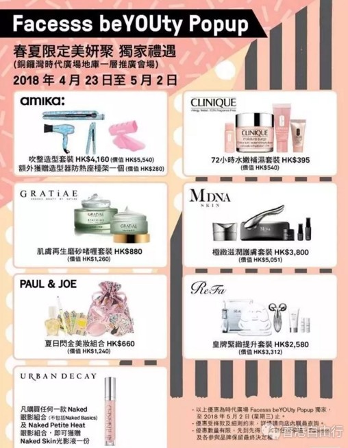 即日起至 5 月 2 日期间,Facesss 进驻 Hong Kong Times Square 地库一层(City Super 对出),为大家带来春夏美容热卖新品,当中六大参与品牌: