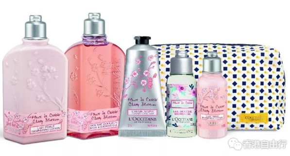 包括:樱花闪亮润肤露 250ml、樱花沐浴啫喱 250ml、樱花润手霜 75ml、樱花沐浴啫喱 75ml、樱花闪亮润肤露 75ml、精美化妆袋