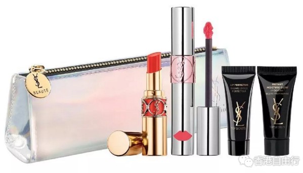 包括:迷魅亮彩唇膏#46、迷魅水嫩护唇釉#8、美颜绝密完美护唇精华3ml、美颜绝密丝缎补湿底霜5ml、YSL Beauté化妆袋