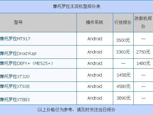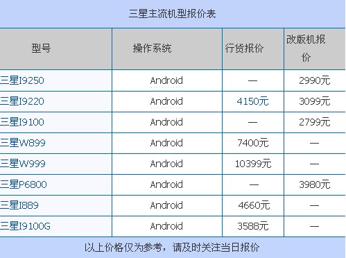 另外,HTC EVO 3D在前段时间,价格一直维持在2200元左右,可谓市面上最超值的双核手机。不过近两天,上游经销商开始收紧货源,加大利润空间,所以价格开始大幅上涨,最终将会长到2500元左右。除了以上个别机型之外,近期其他机型的价格走势还是比较乐观的,下面笔者为大家带来近期热门机型的报价表,希望能给您的选购带来帮助。