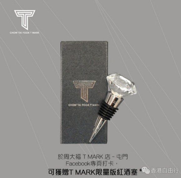 在新店现场打卡分享到微信朋友圈,更送你T MARK限量版红酒塞一个*,数量有限送完即止!分享后,再亲临周大福屯门市广场第2期分行展示更可获足金手工费38折优惠!机会难得,快点来到屯门T MARK新店购物啦!