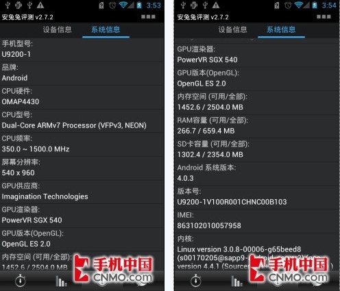 根据官方资料,华为Ascend P1搭载了1.5GHz主频的德州仪器OMAP 4460双核处理器(由于可能是测试软件的信息有误,在超级兔子评测软件中显示的是OMAP 4430处理器),不过主频依旧是1.5GHz,同时还挂载了表现出色的PowerVR SGX 540图形处理器。整体性能让我十分期待。