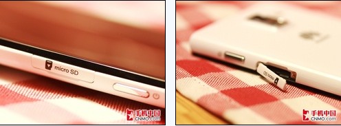 华为Ascend P1的TF卡槽设计在了机身的右侧,并支持热拔插,也是省却了我们更换TF卡的步骤,同时华为也是为卡槽加上了保护盖,能够有效避免灰尘的进入。