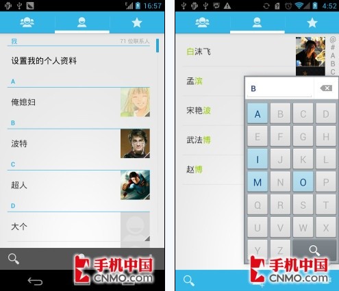 一直以来,国产手机厂商在智能系统的优化上都不是很给力,而在华为Ascend P1上,我们却看到了转变,通过与三星Galaxy Nexus所搭载的原生Android 4.0界面相比,华为Ascend P1在很多细节的设计上,更加贴合国内用户的使用习惯。比如,虽然华为Ascend P1也是使用了原生Android 4.0的联系人界面,不过相比Galaxy Nexus,它还加入了方便国内用户的手机字母快速定位,看出了华为的用心。