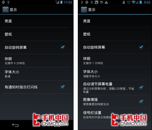 除此之外,华为Ascend P1的显示设置菜单比原生Android 4.0系统多了图像增强与信号栏这两个选项,能够让手机画质更好的发挥。