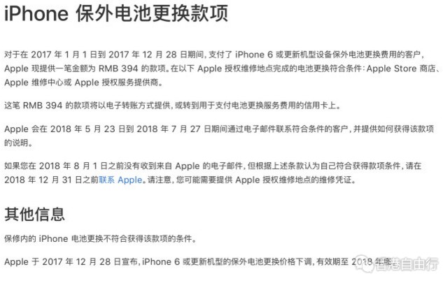 对于在2017年1月1日到2017年12月28日期间,支付了iPhone 6或更新机型设备保外电池更换费用的客户,Apple现提供一笔金额为RMB394的款项。在以下Apple授权维修地点完成的电池更换符合条件:Apple Store商店、Apple维修中心或Apple授权服务提供商。