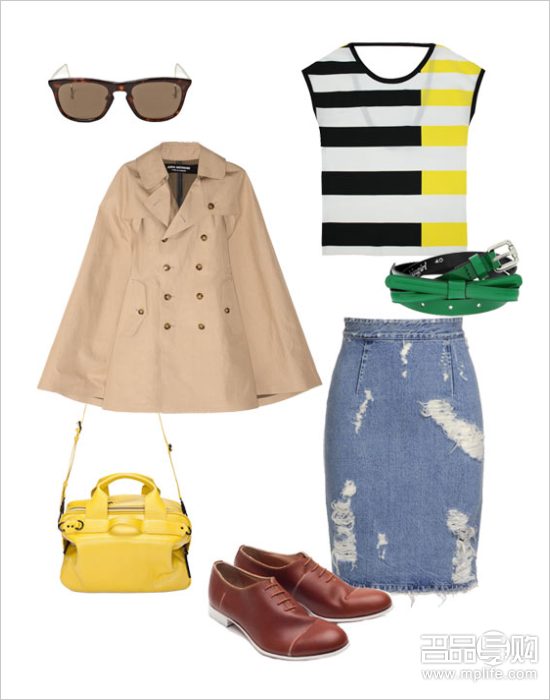 适合城市探索者的干练搭配,披风样式的大衣会让你看起来英姿飒爽,即便是在多风的春天里,也不用担心乱了造型。而内搭的T恤与牛仔裙既有减龄的效果又方便活动。明黄色搭配牛仔永远都不会出错,相机包样式的斜挎包虽然体积不大,但是却空间满满。除了化妆包之外还能放下一个小微单。穿着皮质柔软的牛津鞋,即便是走上一整天也不会觉得累。