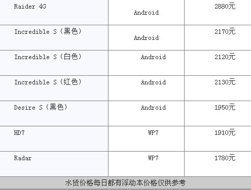 HTC主流机型价格