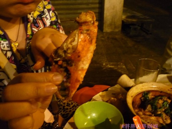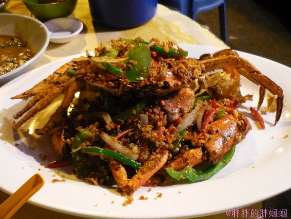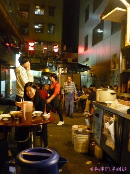 第三站这才是重点,前面都是开胃小菜,这才是主餐,“盛记大排档”香港岛中环士丹利街9-10号铺,这又是一家老字号,牌照有60多年的历史,是香港仅存的几家在高楼大厦中间的大排档了,很有文化背景,老板坚持天天上灶,所以口味一直保持原样!此地多为本地人来这里吃,或者是有香港朋友带去这里吃,游客一般很少能找到这家,除非是像我这样的吃货级别的,我也是在网上查了很久才找到这家老字号大排档,真是值得一去。这家那是相当的难找,如果不是提前做好功课根本想不到这高楼大厦的中间过道会有如此美味的露天大排档,我们点了避枫塘炒蟹:本港特色蟹大肥美,必点菜品。干贝丝青菜:料相当的足。鸡煲,猪肝铺底,口味各具特色。椒盐虾,口味也不错,量足,吃下来一共450港纸。这要是在”桥底“之类的餐馆 单一道避枫塘炒蟹就要港纸400左右吧~….这餐相当物美价廉又具香港本地特色。