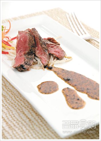 和牛先切成薄片,放入黑松露酱、黑胡椒、红酒腌10分钟至入味后轻煎,入口油香、酒香、松露香集一身,百味纷陈。