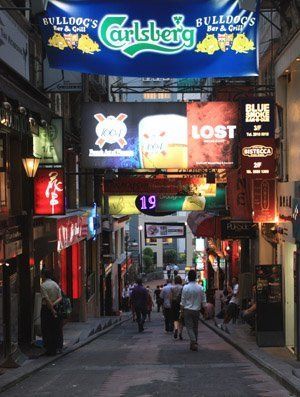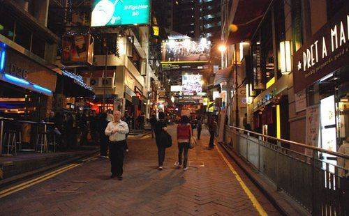 两条平行的步行街,外加一小段连接两条步行街的大道,实在不能和我想象中的浪漫情调相比。步行街不长,每条街步行不过七八分钟路程。街道两旁的酒吧门面狭小,灯光黯淡,布置也没什么特别。不过每走两三步,都能见到一两个“老外”端着酒杯当街而立,边饮边聊,确实在内地酒吧中难能见到。“外籍人不少,以白领居多,是兰桂坊的最大特色。”