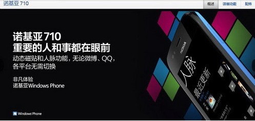 该机行货版本的搭载的系统版本还增加了对漫游的设置以及用户将可以在一个彩信(即MMS信息)上添加多个附件,包括图片、声音和视频等新功能。此外,在官网的诺基亚Lumia710行货版本的介绍中出现的“动态磁贴和人脉功能,无论微博还是QQ,各平台无需切换”,似乎说明在本地社交应用上又有新的进步,这使得国内用户在使用这些熟悉的应用的时候会更加的方便。
